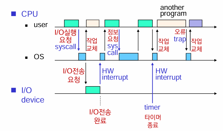 CPU가 인터럽트를 처리하며 동작하는 것을 타임라인으로 보자면 이렇다.